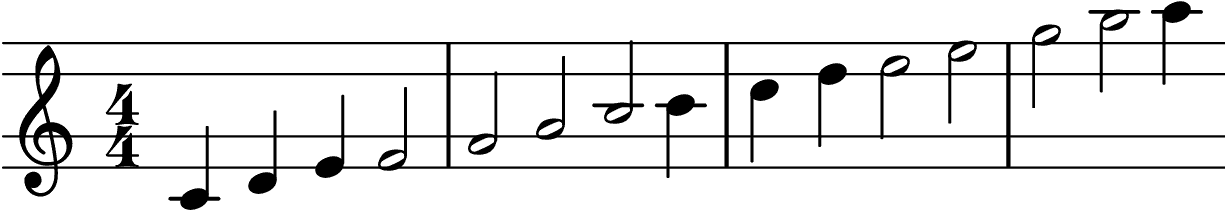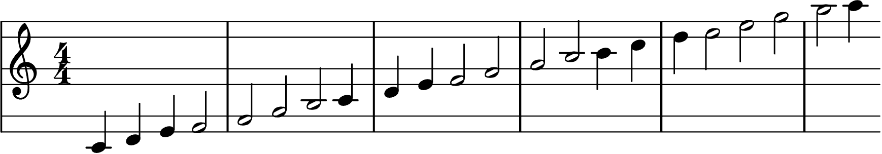 As 2015 hurtles to a close it is a good time to look back at recent improvements to the code for rendering Clairnote with LilyPond. At this point it seems like a story of diminishing returns for effort expended, perhaps some version of that 80/20 thing, where 80% of the effort goes towards 20% of the functionality, as more marginal "corner cases" take more effort to implement or fix. (Or maybe it's just the 90/90 rule?) The main focus of this blog post is a case in point – getting the correct default stem direction on 3-octave staves.