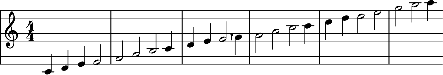 I'll pass over the more technical details and just cover the syntax. Below are some examples taken from the Software:LilyPond page where all of this is documented. Note that rather than the previous \cnThreeOctaveStaff or \cnFourOctaveStaff, we now use \cnStaffOctaveSpan 3 or \cnStaffOctaveSpan 4 instead. It's better to have a single command that can handle any number of octaves.