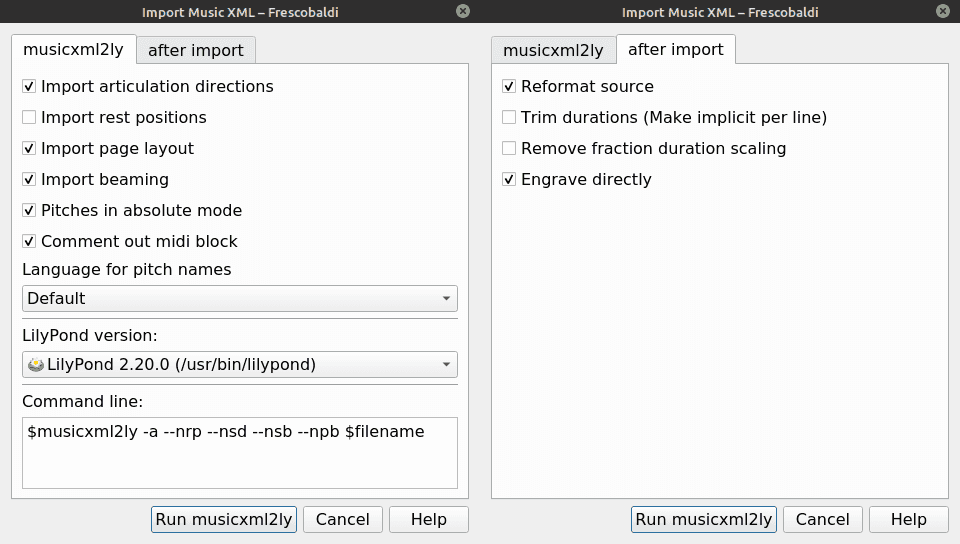 Now we switch back to Frescobaldi where we will import the MusicXML file. Click on "File" > "Import" > "Import MusicXML" and select the MusicXML file created with MuseScore. A window with various options will pop up: