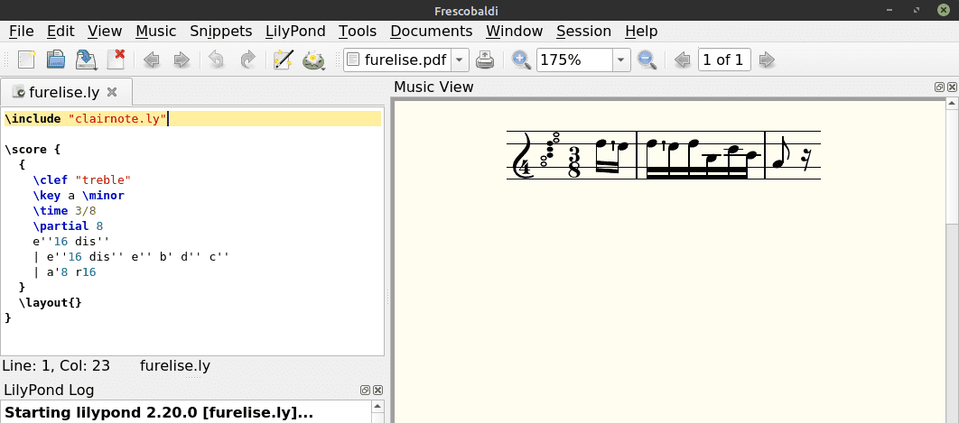 After clicking on the button with the LilyPond symbol (the water lily), at the top of the window, the sheet music is displayed in the right panel. If the file was previously saved (third buttom from the left), a PDF file is generated in the same folder in which the text file (with extension ".ly") is located. Note that you will need to have the clairnote.ly file in the same folder in which you have the LilyPond file (which in the example above is called "furelise.ly").