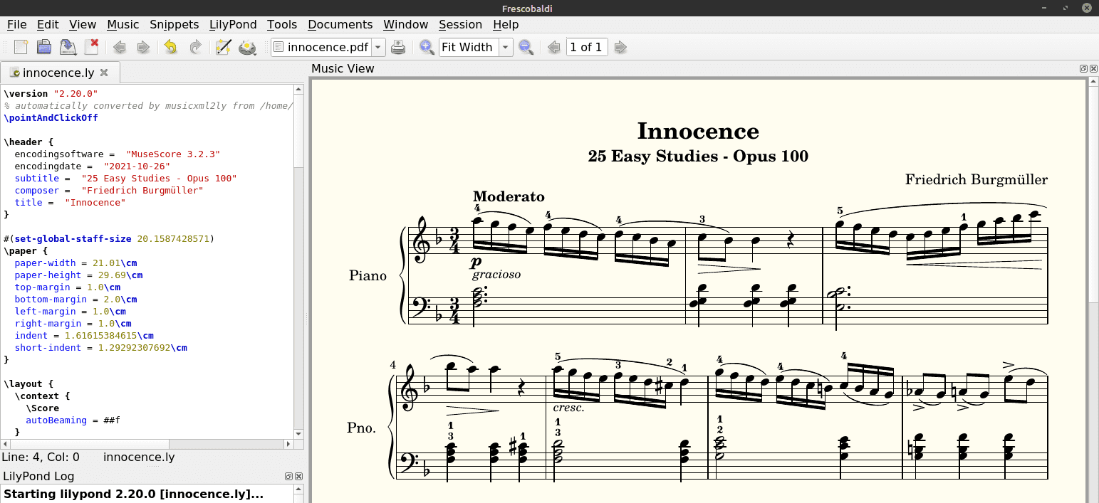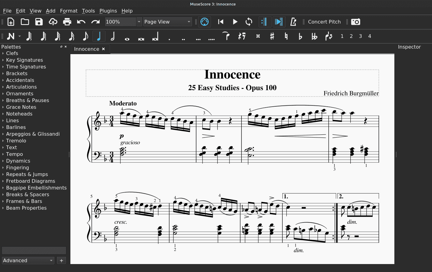 Now we are going to use as an example a piano piece called Innocence, written by Friedrich Burgmüller. The following image shows this piece being edited in MuseScore.