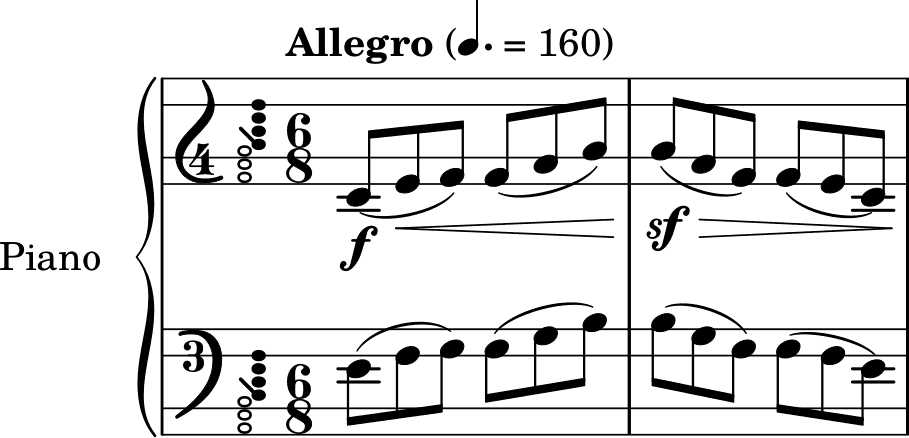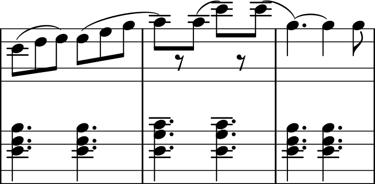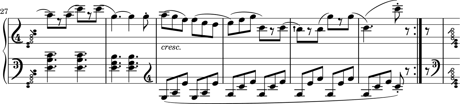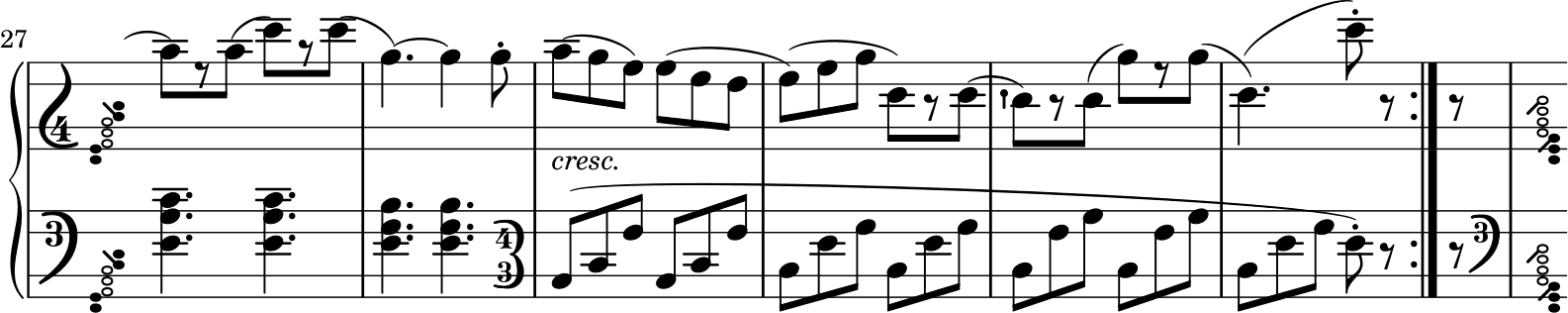 For the sake of completeness, let’s see how to write arpeggios. Imagine we wanted to play the notes in measure 8 as an arpeggio covering both staves. To specify it, first we have to write the command \arpeggio just after each of the desired notes. For example, measures 7 and 8 for the right-hand staff would be: