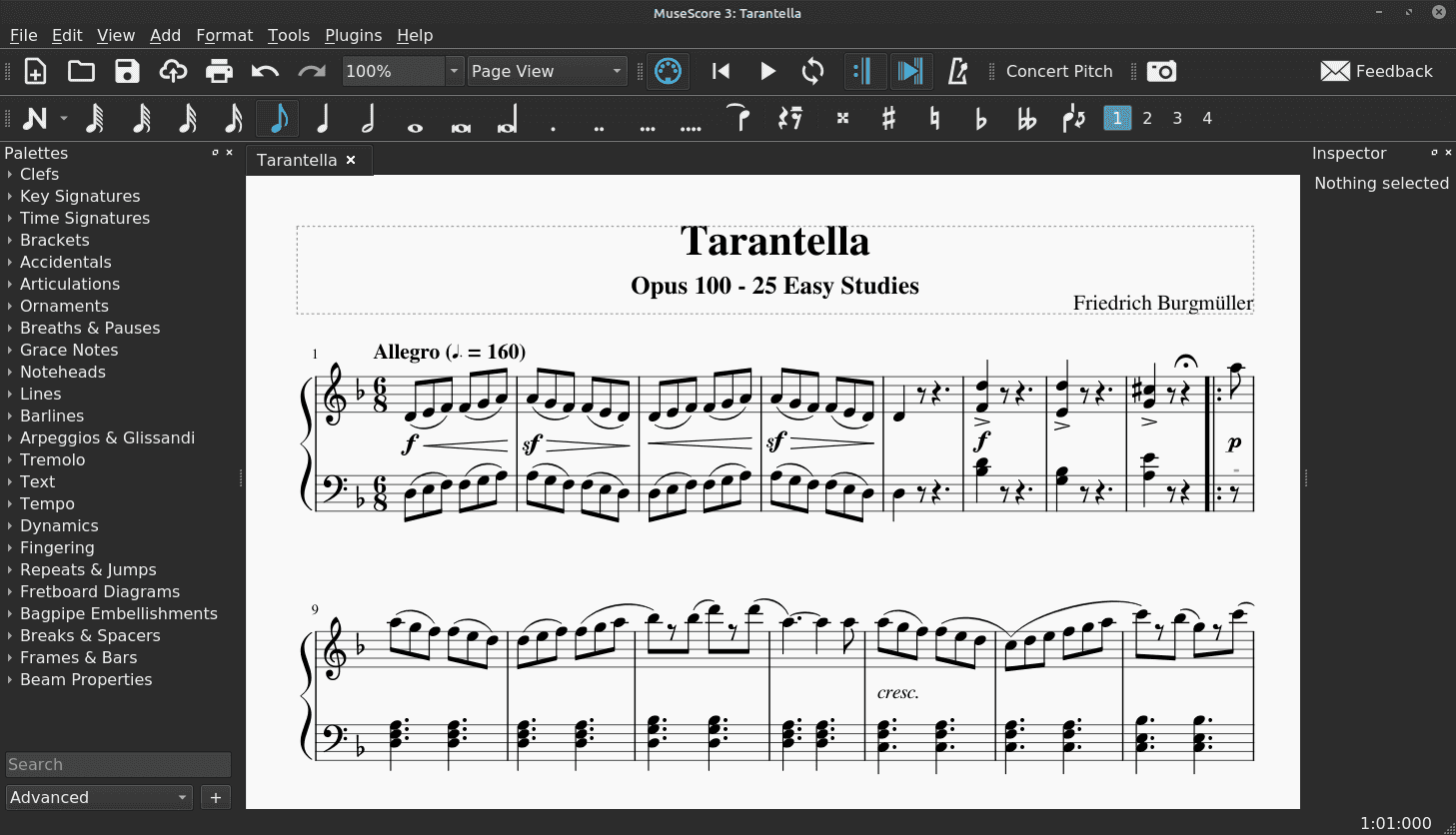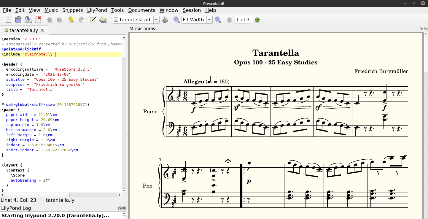 In this post we will cover some more cases in which one has to finish the editing of the score in Frescobaldi, but some of these are actually important changes instead of minor ones. We will use as an example the piano piece Tarantella, written by Friedrich Burgmüller.