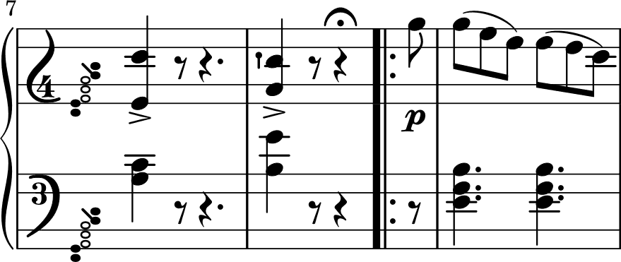 <g' cis''>4 -> r8 r4 ^\fermata s8 \repeat volta 2 {