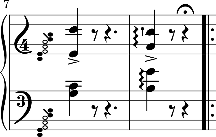 <g' cis''>4 \arpeggio -> r8 r4 ^\fermata \repeat volta 2 {