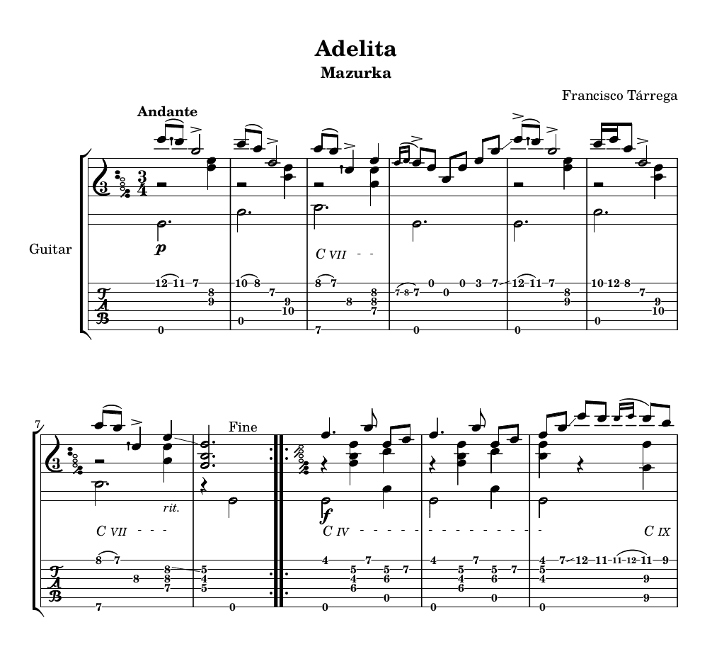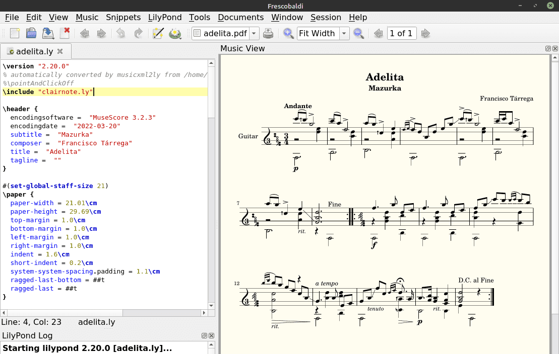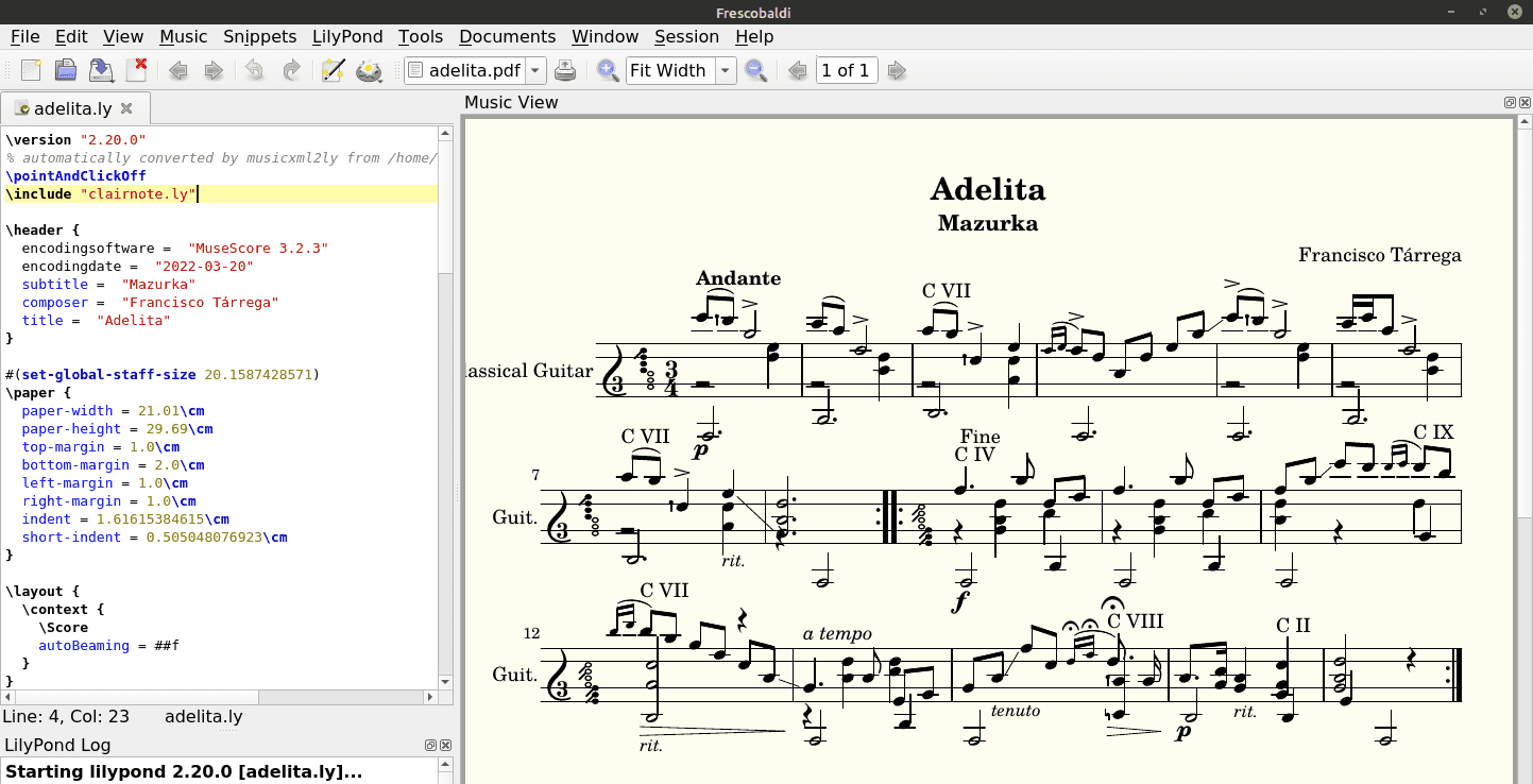 - Adelita - LilyPond file after conversion from the MusicXML file